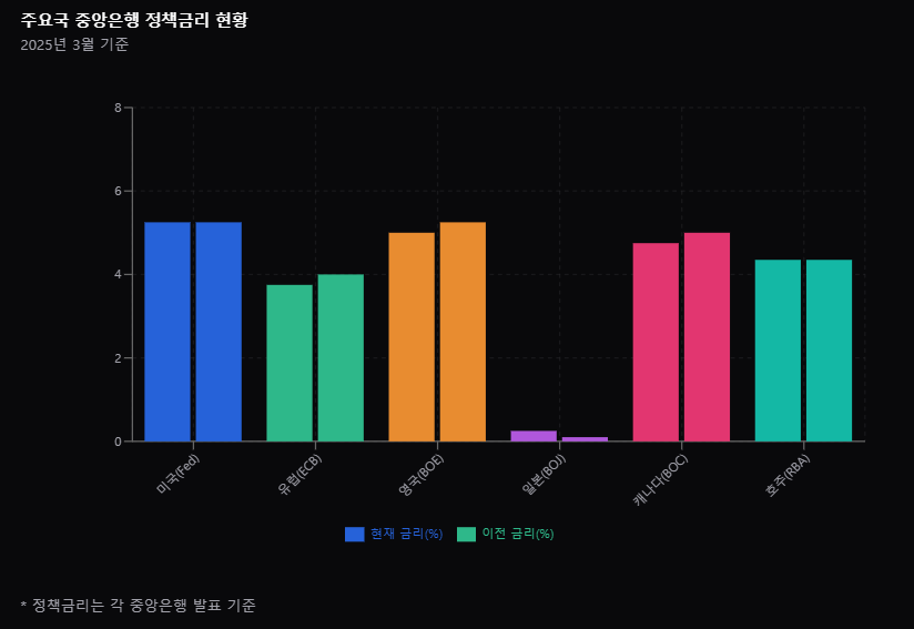 주요국 중앙은행들은 트럼프 관세 부과에 따른 불확실성과 영향을 우려하며 정책금리를 동결하는 모습을 보이고 있다.