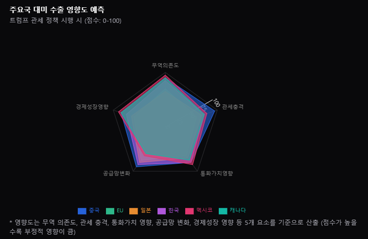 위 레이더 차트에서 볼 수 있듯이, 트럼프의 관세 정책이 시행될 경우 중국과 멕시코가 가장 큰 영향을 받을 것으로 예상된다.