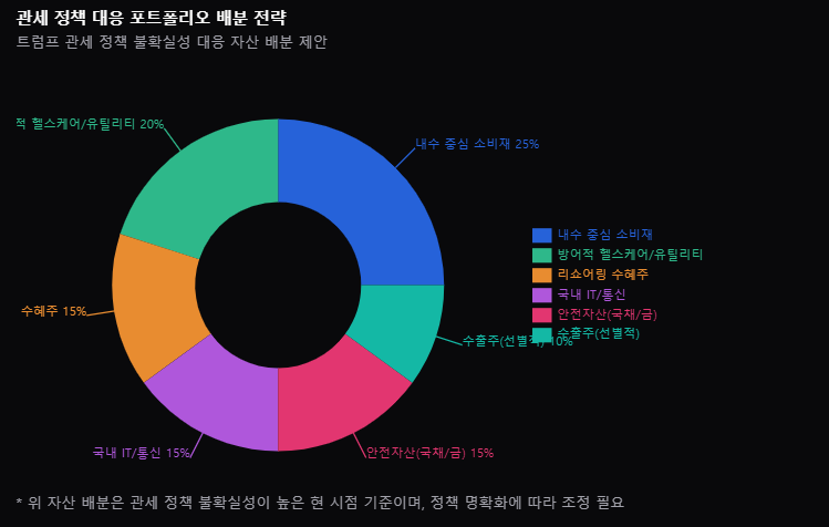 1. 방어적 포트폴리오 구성: 관세 정책 불확실성이 해소될 때까지 안전자산 비중을 확대하고, 변동성이 큰 자산의 비중은 축소하는 것이 바람직하다.