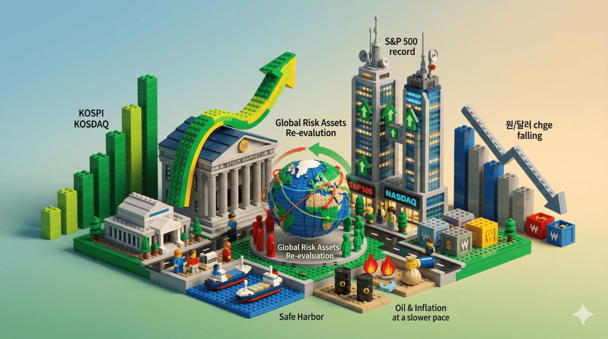 시장은 뉴스 헤드라인보다 먼저 리스크 프리미엄을 깎기 시작했고, 그 결과가 한국에서는 외국인 순매수와 원화 반등으로 보였고 미국에서는 S&P500과 나스닥의 신고가로 나타난 것입니다.