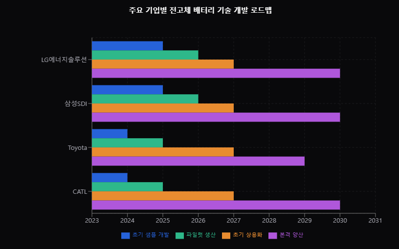 일본에서는 Toyota가 Panasonic과 협력하여 2027-28년 전고체 전지 탑재 차량 출시를 목표로 적극적인 개발을 진행 중입니다. 중국의 CATL은 자체 개발한 전고체 기술을 바탕으로 2027년 상용화를 추진하고 있으며, 중국 정부의 강력한 지원을 받고 있어 빠른 발전이 예상됩니다.
