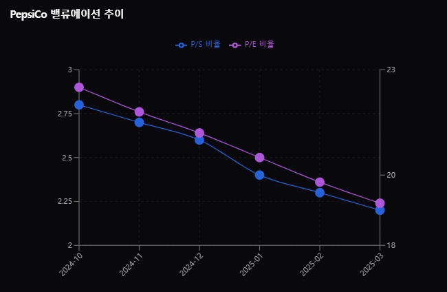 현재 PepsiCo의 가격은 투자자들로 하여금 구미를 당기게 하고 있습니다. 최근 6개월간 15% 이상 주가가 떨어졌지만, 기술적 신호들을 보면 바닥을 형성하고 있고 곧 상승 반전이 예상되는 그림을 그리고 있습니다. 실적은 다소 엇갈린 결과를 보였고 2025년 전망도 약간 약화됐지만, 현재 주가는 이런 상황을 충분히 반영하고 있습니다. 특히 P/S 비율이 많이 줄어든 것은 지금 주가가 부담을 많이 덜어 매력적인 가격에 다가오고 있음을 보여주고 있습니다.